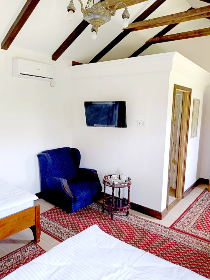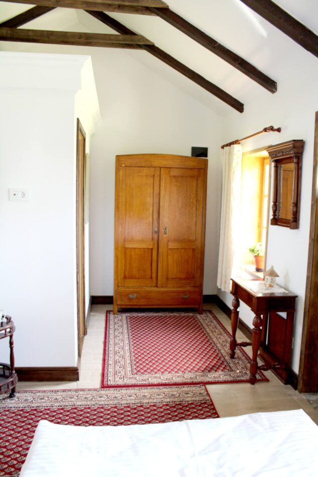 Udoban bračni krevet, vintage nameštaj i nežni tonovi stvaraju savršeno utočište za dvoje. Idealno za parove koji žele tišinu i komfor.